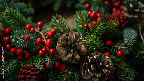© Prakakrong, Fototapeta premium A close-up of a Christmas wreath with pinecones and berries