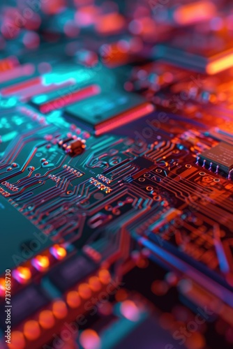 © Nikolay, Fototapeta premium A close up of a circuit board with colorful lights. Generative AI.