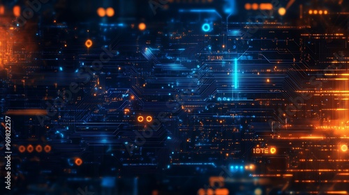 © Tcukimay, Naklejka premium A close-up of a circuit board with glowing blue and orange lines, creating a futuristic, technological aesthetic.