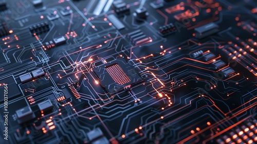 © Galib, Obraz premium A close up of a circuit board with glowing orange lines and a black processor chip.
