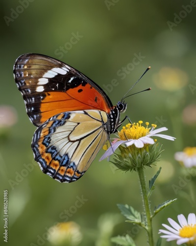 Fototapeta premium A close-up of a colorful butterfly perched on a wildflower in a lush meadow, with soft focus on the background