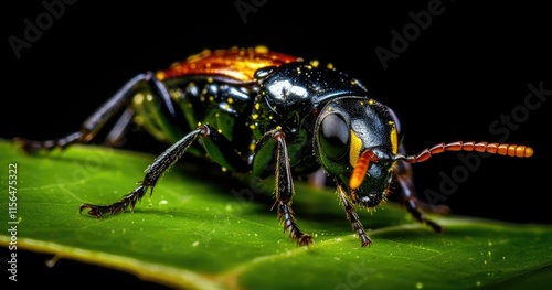 Fototapeta premium A close-up of a colorful insect perched on a leaf, showcasing intricate details.