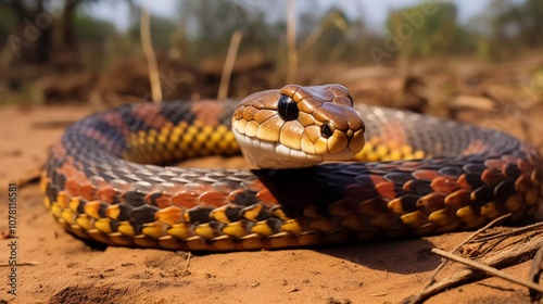 © amai line art, Fototapeta premium A close-up of a colorful snake resting on the ground in a natural environment.