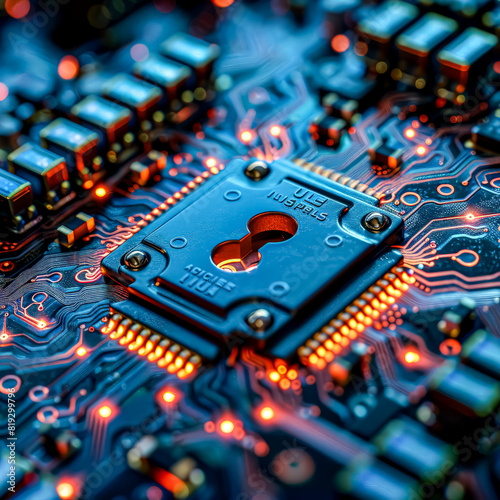 © Людмила Мазур, Fototapeta premium A close up of a computer chip with a keyhole in it. The chip is a microprocessor and the keyhole is a security feature