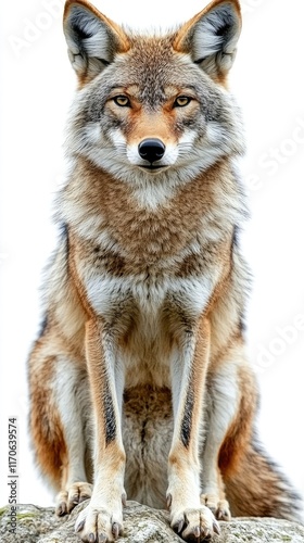 © isti, Obraz premium A close-up of a coyote sitting confidently against a white background.