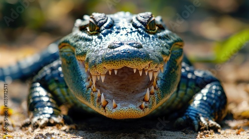 © Robin, Fototapeta premium A close-up of a crocodile displaying its sharp teeth.