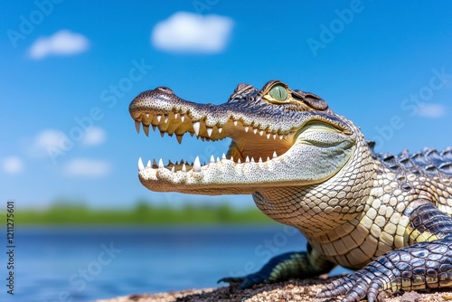 © Manon, Fototapeta premium A close-up of a crocodile displaying its sharp teeth, basking near a water body under a bright blue sky with fluffy clouds.