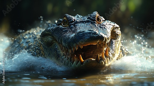 Fototapeta premium A close-up of a crocodile's head emerging from the water, with its mouth open...