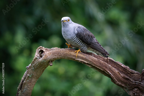 © alan1951, Fototapeta premium A close up of a cuckoo, Cuculus canorus, as it perches on an old branch. The green natural out of focus background has space for text