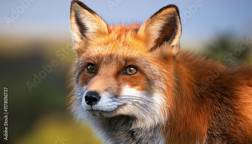 © Maxie, Fototapeta premium a close up of a curious red fox with hanging fur searching alert and attentive towards a gentle neutral historical past in a natural putting