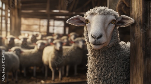 © Nathan, Obraz premium A close-up of a curious sheep in a rustic barn, surrounded by a flock in soft sunlight.