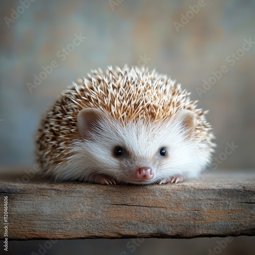 © nattapon, Fototapeta premium A close-up of a cute hedgehog resting on a wooden surface against a soft, blurred background, This image can be used for educational materials, pet care articles, or nature-themed blogs,