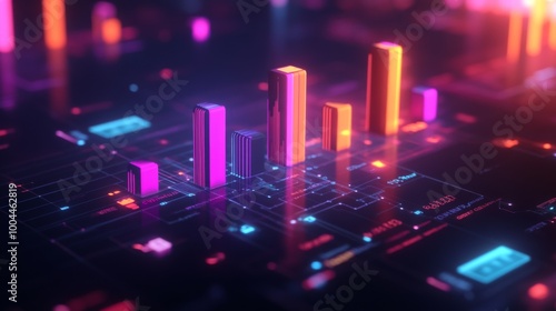 Obraz premium A close-up of a 3D bar chart with vibrant colors, floating above a digital grid, showcasing data trends with numbers and icons appearing next to the bars