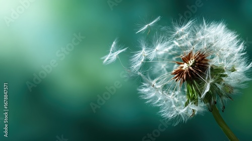 © Dulemegapixel, Fototapeta premium A close-up of a dandelion puff in bloom, with delicate seeds ready to disperse, encapsulating the beauty of nature and the fleeting moments of life in a soft, dreamy background.