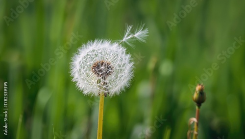 Fototapeta premium A close-up of a dandelion puffball in a field, swaying softly in the wind,...
