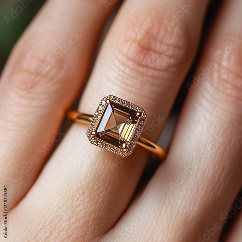 © DrCreative, Fototapeta premium A close-up of a delicate gold ring featuring a square-cut gemstone with a halo of small diamonds, worn on a woman's finger