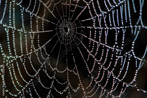 © Zape, Naklejka premium A close-up of a delicate spider web glistening with dew drops.