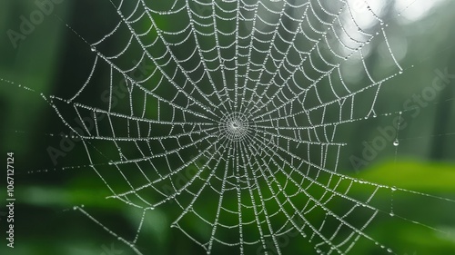 © Rachakrit, Naklejka premium A close-up of a dewy spider web intricately woven, glistening in a lush green forest backdrop.