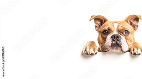 © BerkahStock, Obraz premium A close-up of a dog resting its head on a surface, looking curious and playful.