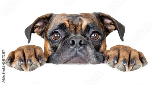 © BerkahStock, Obraz premium A close-up of a dog's face with paws resting on a surface, looking curiously.