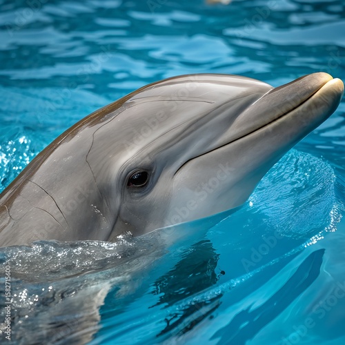 Naklejka premium A close-up of a dolphin swimming in clear blue water. The dolphin has a...