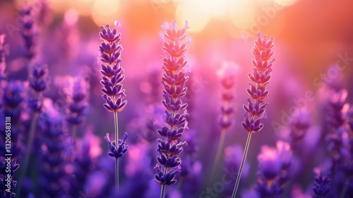 © khumthong, Fototapeta premium a close-up of a field of purple lavender flowers with soft sunlight in the background, evokes a sense of peace and tranquility