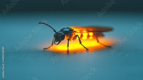 © SlashStd, Fototapeta premium A close-up of a firefly with glowing abdomen, placed on a white surface