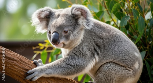 Obraz premium A close-up of a fluffy, gray koala resting peacefully on a tree branch in a...