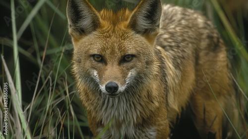 Fototapeta premium A close-up of a fox in a field of tall grass, gazing sadly at the camera with...