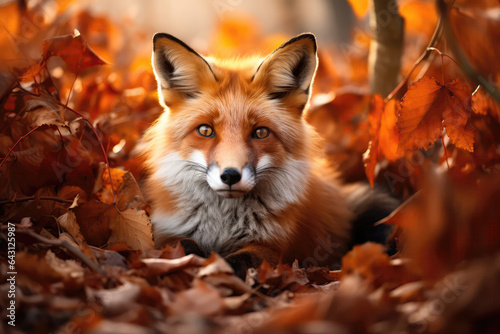 © Anastasiia, Fototapeta premium A Close Up Of A Fox Laying In Leaves