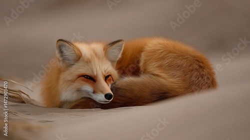 © Igor, Fototapeta premium A close-up of a fox lying on a bed, with its head resting on its back