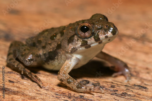 Fototapeta premium A close up of a frog sitting on a wooden surface. This amphibian has the...