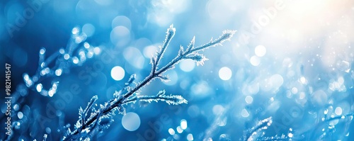 Fototapeta premium A close-up of a frosted branch glimmering in blue light, surrounded by sparkling bokeh, capturing the essence of winter beauty.