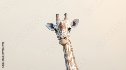 © Tanakrit, Naklejka premium A close-up of a giraffe's head with expressive eyes, showcasing its unique features against a soft, neutral background.