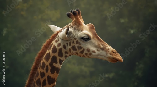 © Oleg, Obraz premium A close up of a giraffe's head with trees in the background