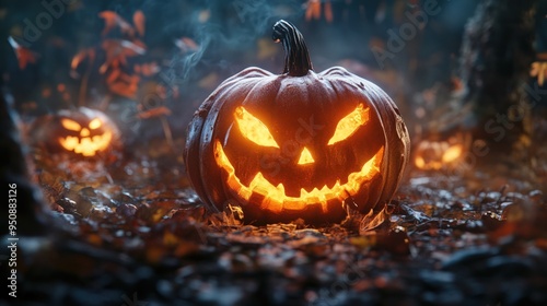 Fototapeta premium A close-up of a glowing jack-o-lantern with a menacing grin, surrounded by other pumpkins in a foggy forest.