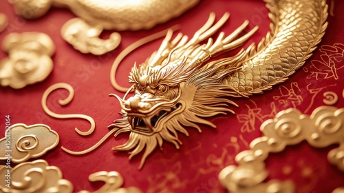 © พงษ์ศักดิ์ อ่อนพฤกษ์, Naklejka premium A close-up of a gold dragon graphic intricately embossed on a red Chinese New Year card. The shimmering details stand out against the vibrant background, symbolizing power and prosperity.