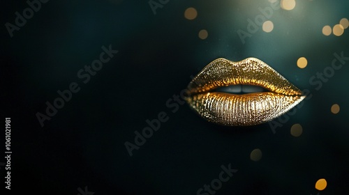 © Igor, Naklejka premium A close-up of a golden lip on a black backdrop, featuring gold sparkles on the lips and a woman's mouth
