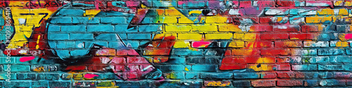 Fototapeta premium A close-up of a graffiti-covered brick wall, bearing messages from the...
