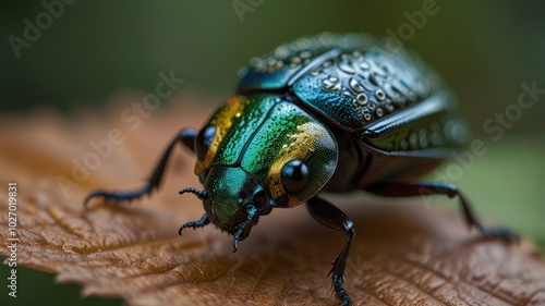 © kucret, Naklejka premium A close-up of a green and blue beetle with water droplets on its back, perched on a brown leaf.