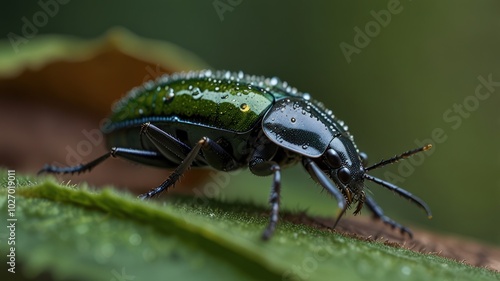 Fototapeta premium A close-up of a green beetle with water droplets on its back, perched on a...