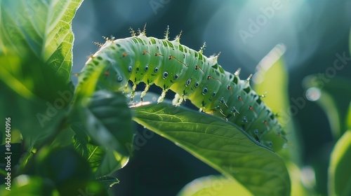 © Scott, Naklejka premium A close-up of a green caterpillar on a leaf in a summer garden.