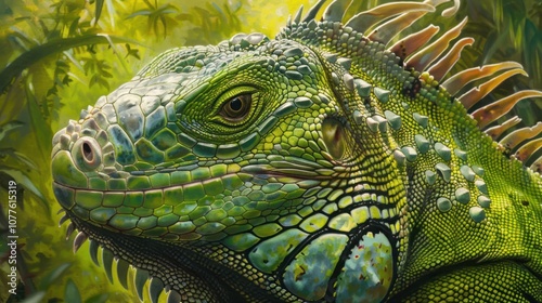 Fototapeta premium A close-up of a green iguana showcasing its textured scales, sharp spines,...
