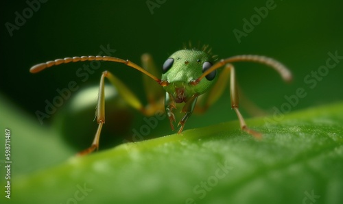 © Olga, Fototapeta premium a close up of a green insect on a green leaf. generative ai