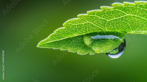 © BerkahStock, Fototapeta premium A close-up of a green leaf with a water droplet, highlighting nature's beauty.