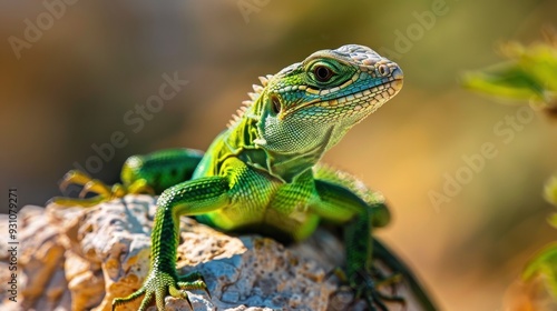 Fototapeta premium A close-up of a green lizard basking on a sunlit rock, blending with its...