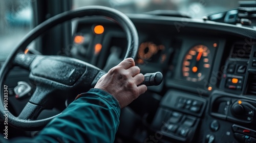 © BerkahStock, Obraz premium A close-up of a hand gripping a steering wheel inside a vehicle's cockpit.