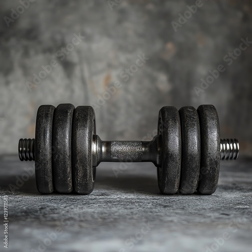 Naklejka premium A close-up of a heavy black dumbbell resting on a textured surface,...