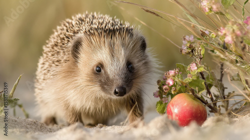 © Shivani, Fototapeta premium a close-up of a hedgehog on a sandy ground. The hedgehog is facing towards the right side
