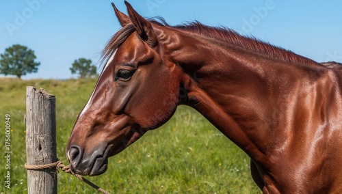 © The 2R Artificiality, Obraz premium A close-up of a horse fastened to a post.